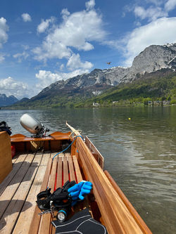 As a special highlight we offer exclusively and in cooperation with "Schifffahrt Grundlsee" the opportunity to go with such a boat to the so-called "Ressenwand" (or other places at Grundlsee, of course, by prior arrangement) and do a guided dive there.